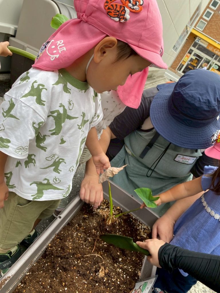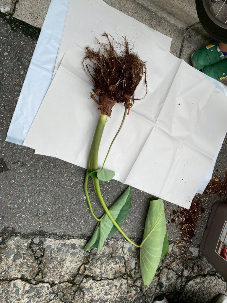 夏前にみんなで植えた里いもの大きな葉っぱが枯れてきたので、収穫しました!!
