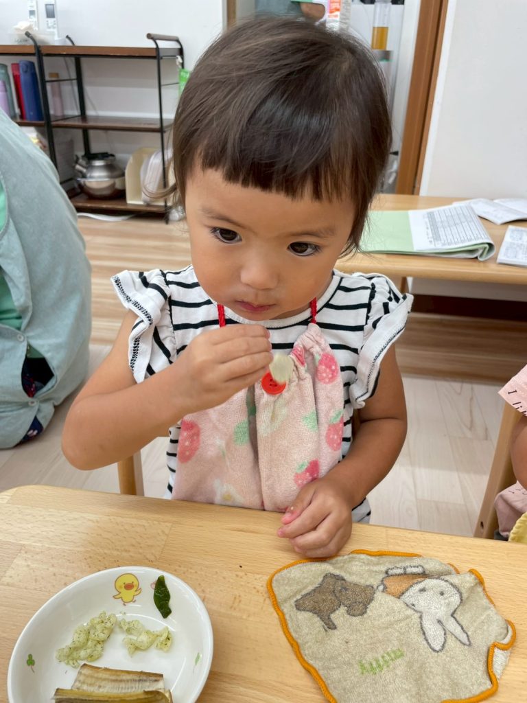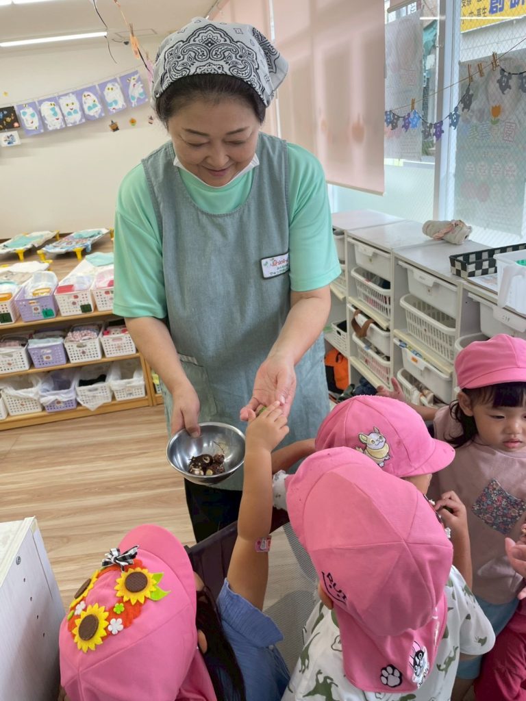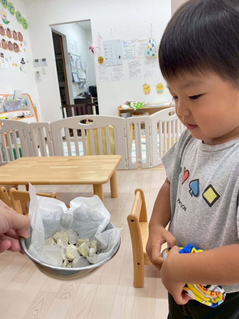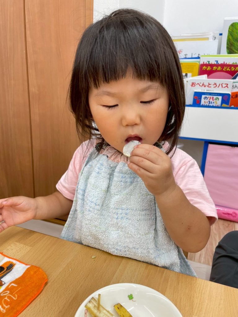 収穫した里いもを給食の先生に持って行って、美味しいおやつにしてもらいました!